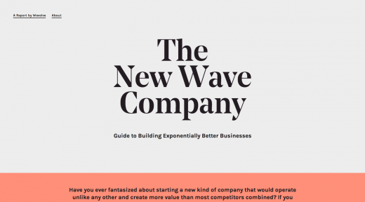 过 去几年中,网站设计中十分流行大标题背景图像,上面经常有文字说明,这也是大多数访客浏览网站时首先看到的东 西。而在大标题背景图像如此流行的情况下,你的网站如何能脱颖而出呢?采取相反措施。近来出现的一些网站逆势而行,即没有大标题背景图像。我猜,他们这样 做不仅仅是不愿意追随潮流,而且也在寻求提高网站的性能与速度。New Wave Company的网站就体现出这些特点。它使用大标题欢迎访客,大字体 集中在网页中心,但标题后面没有大背景图片。这是一种高雅的做法,效果并不次于其他使用大背景图像的流行网站设计。